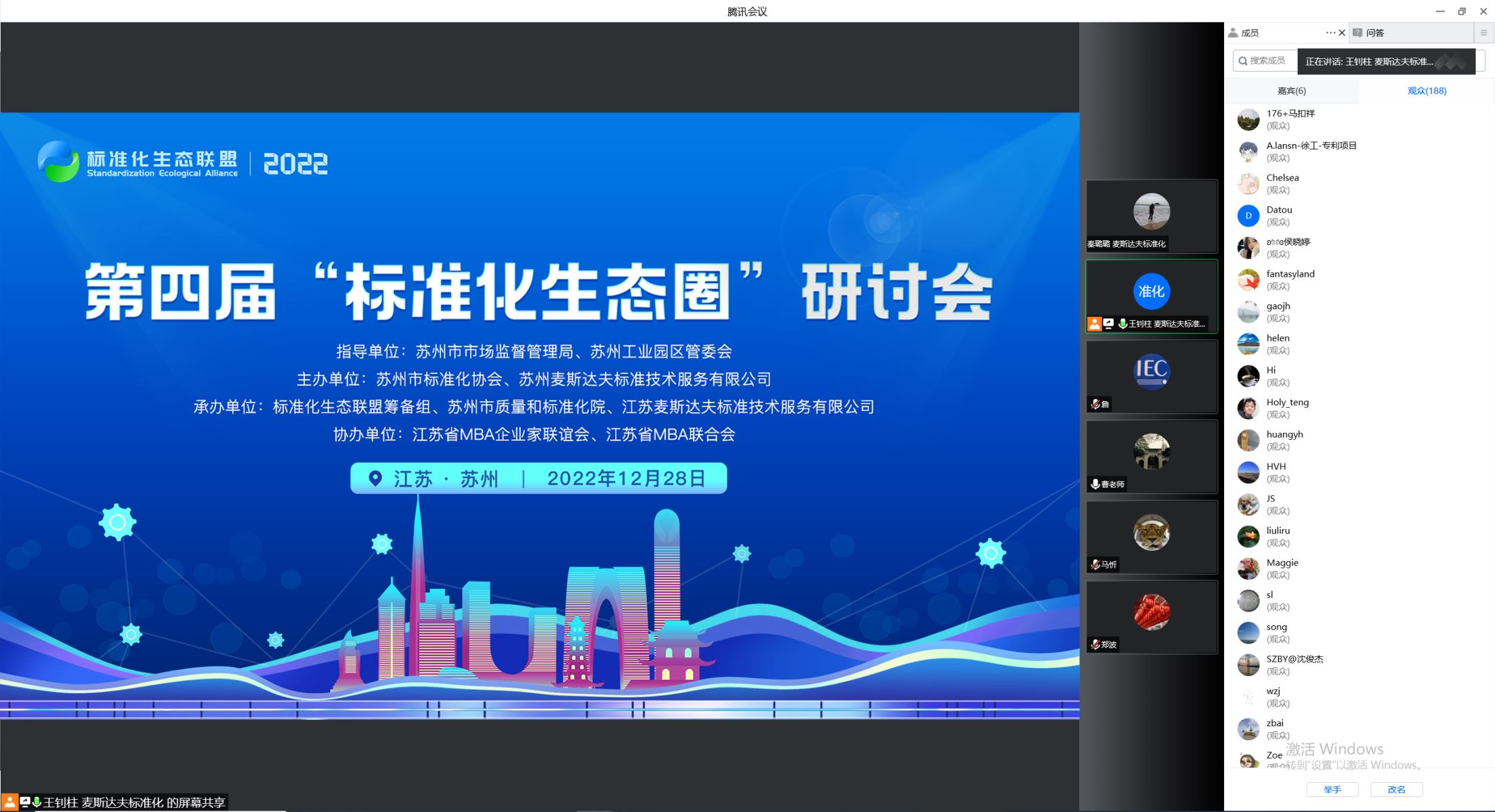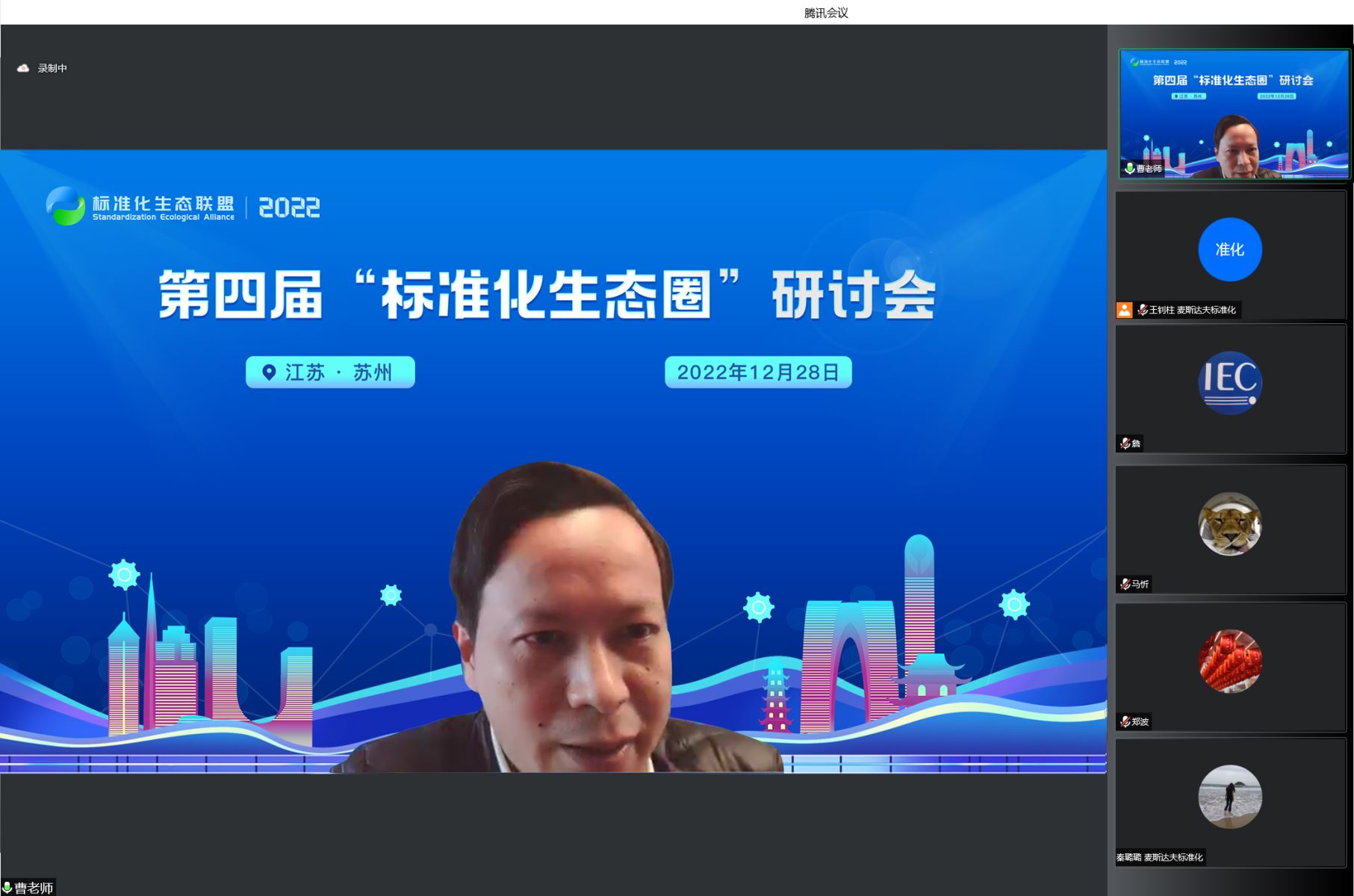 2022年12月28日,由麥斯達夫發(fā)起的第四屆“標準化生態(tài)圈”研討會在蘇州舉辦,會議以線上線下相結合的形式召開。本屆“標準化生態(tài)圈”研討會在蘇州市市場監(jiān)督管理局、蘇州工業(yè)園區(qū)管委會的指導下,由蘇州市標準化協(xié)會、蘇州麥斯達夫標準技術服務有限公司主辦,標準化生態(tài)聯(lián)盟籌備組、蘇州市質量和標準化院、江蘇麥斯達夫標準技術服務有限公司承辦。蘇州市市場監(jiān)督管理局調研員、蘇州市標準化協(xié)會理事長李平,蘇州市市場監(jiān)督管理局標準化管理處處長曹秀峰,蘇州市質量和標準化院院長、蘇州市標準化協(xié)會秘書長沈俊杰出席會議,往屆標準化生態(tài)圈聯(lián)合發(fā)起單位代表、蘇州市標準化協(xié)會各理事單位和會員單位代表以及線上報名的來自全國各地政府、企業(yè)、高校、科研院所等共計一千三百余人參會,會議同步在“騰訊會議”和“蔻享學術”平臺實時直播。會議由麥斯達夫標準化市場總監(jiān)王釗柱主持。