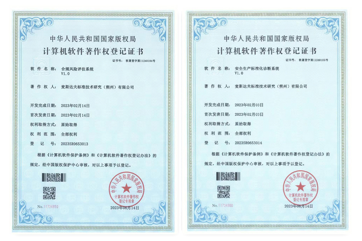2023年6月16日,麥斯達(dá)夫標(biāo)準(zhǔn)技術(shù)研究 (朔州)有限公司獲得四項軟件著作權(quán)證書,“基層檢察服務(wù)標(biāo)準(zhǔn)化系統(tǒng)V1.0”“企業(yè)合規(guī)運行標(biāo)準(zhǔn)化系統(tǒng)V1.0”“合規(guī)風(fēng)險評估系統(tǒng)V1.0”“安全生產(chǎn)標(biāo)準(zhǔn)化診斷系統(tǒng)V1.0”。