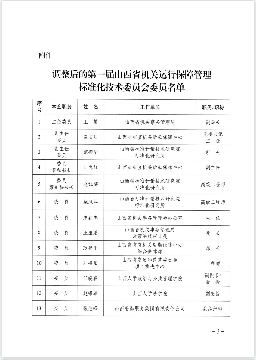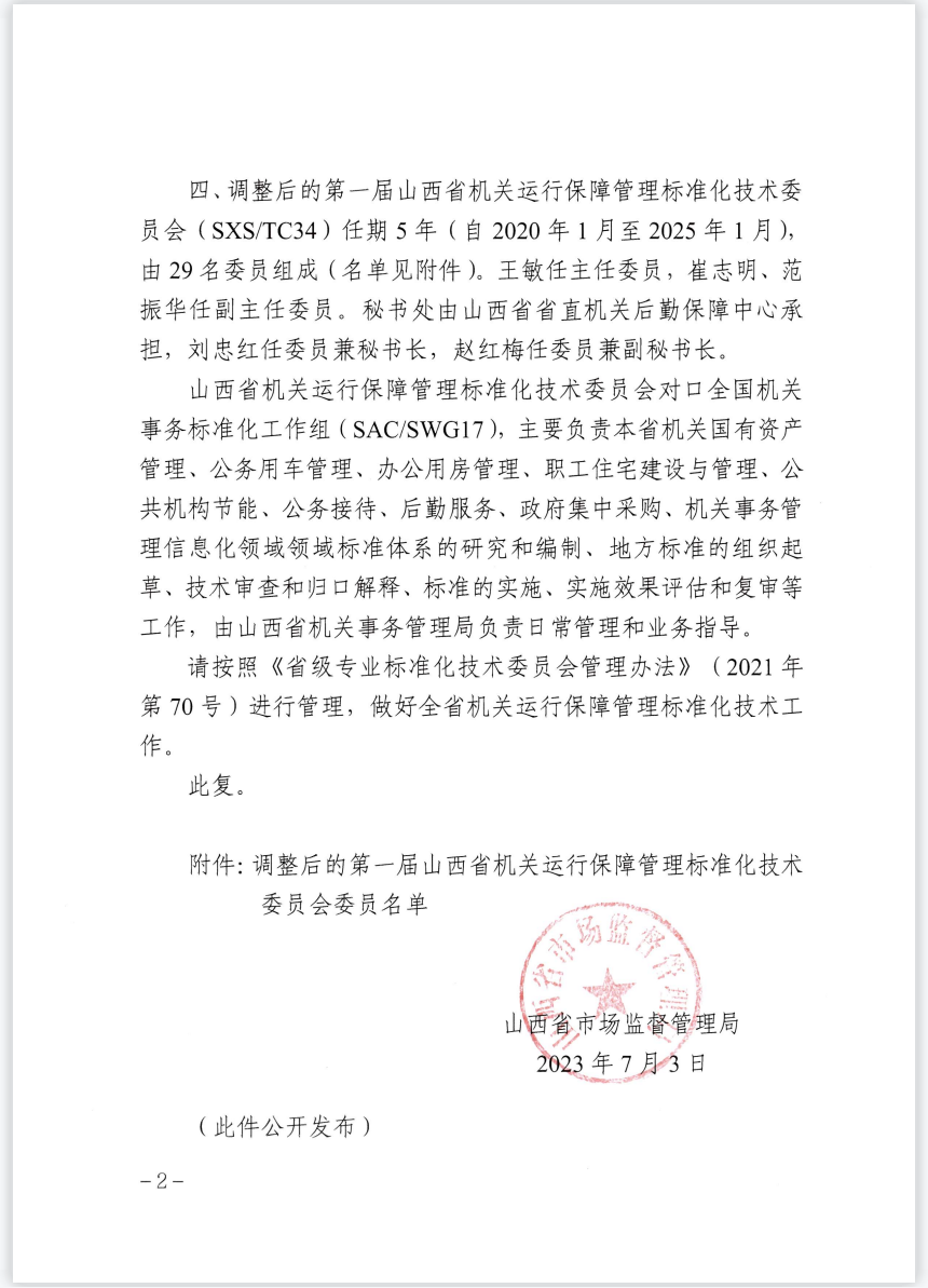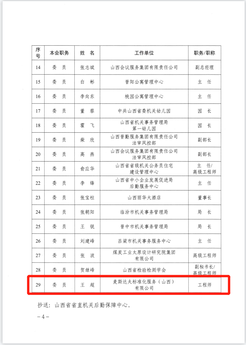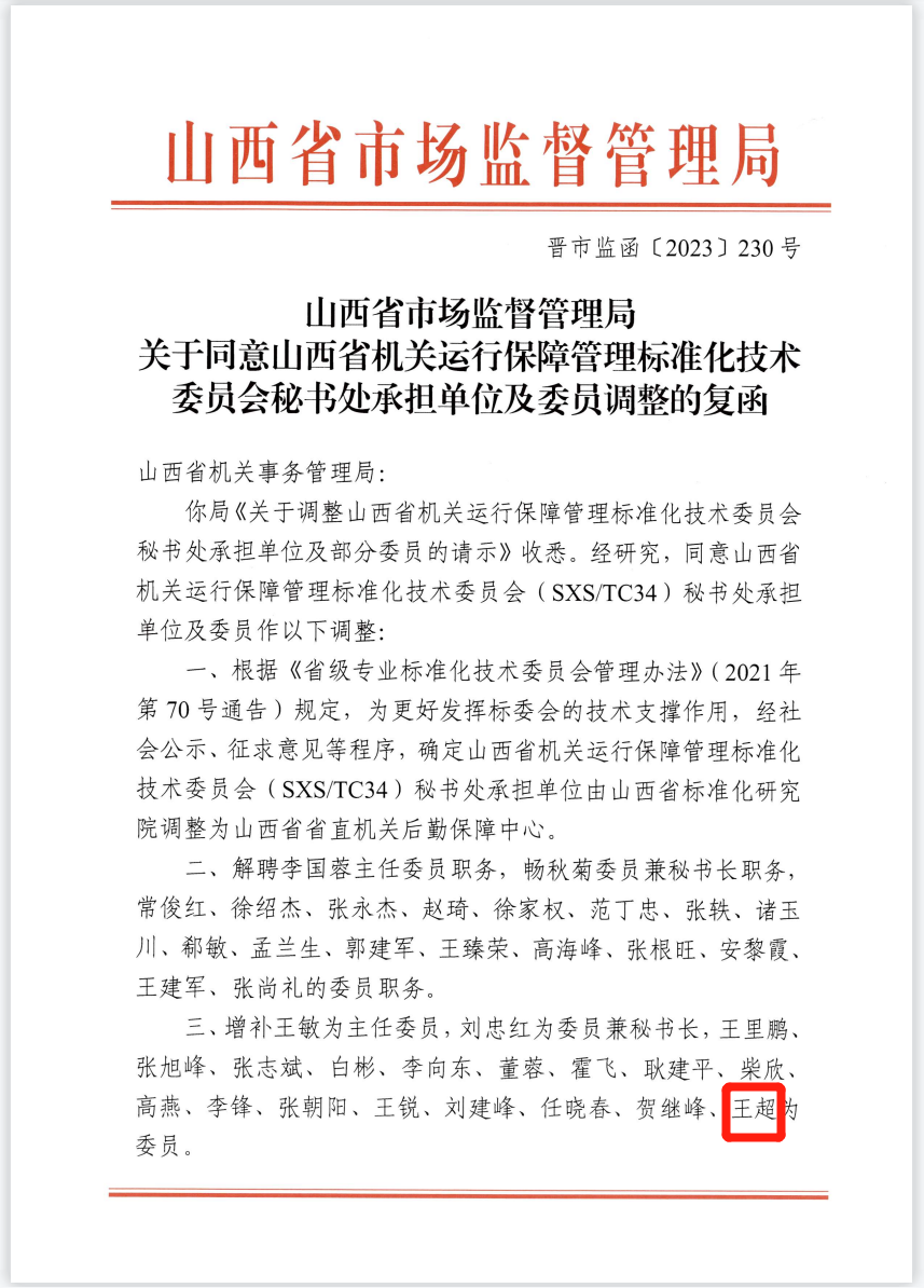 2023年7月3日,根據(jù)《山西省市場監(jiān)督管理局關(guān)于同意山西省機關(guān)運行保障管理標準化技術(shù)委員會秘書處承擔單位及委員調(diào)整的復(fù)函》,麥斯達夫標準化首席運營官王超當選山西省機關(guān)運行保障管理標準化技術(shù)委員會委員。