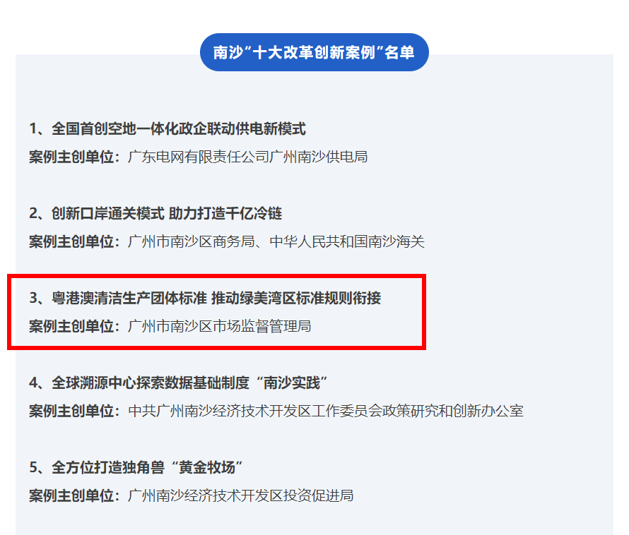 粵港澳清潔生產(chǎn)團體標準入選廣州南沙十大改革創(chuàng)新案例