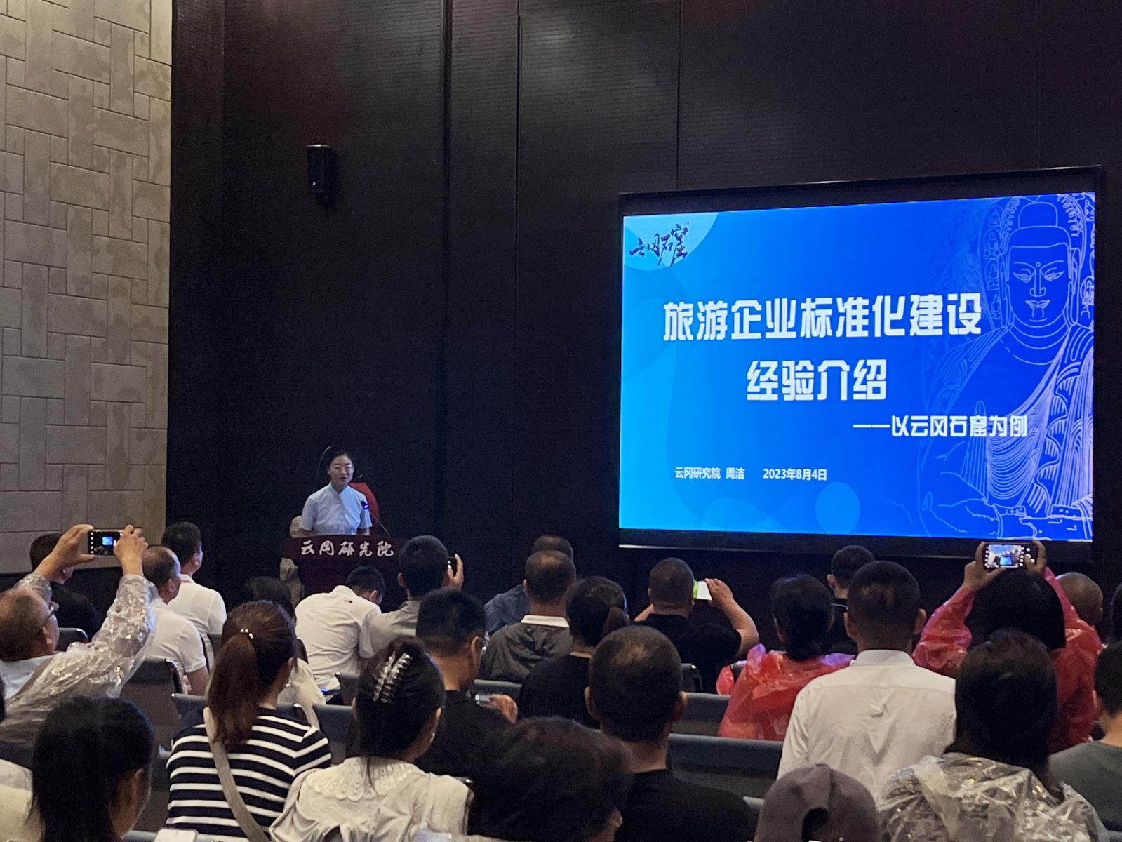 在培訓(xùn)班壓軸環(huán)節(jié),云岡研究院周潔以《旅游企業(yè)標(biāo)準(zhǔn)化建設(shè)經(jīng)驗(yàn)介紹——以云岡石窟為例》為題,系統(tǒng)介紹了云岡石窟景區(qū)旅游服務(wù)標(biāo)準(zhǔn)化建設(shè)的實(shí)施路徑、標(biāo)準(zhǔn)體系和創(chuàng)建成果,分享了標(biāo)準(zhǔn)化工作心得體會(huì),重點(diǎn)解讀了云岡研究院推動(dòng)旅游服務(wù)和文物保護(hù)融合發(fā)展的典型經(jīng)驗(yàn)。培訓(xùn)結(jié)束后,組織學(xué)員集體入園,現(xiàn)場觀摩了云岡研究院旅游服務(wù)標(biāo)準(zhǔn)化試點(diǎn)的建設(shè)成效。
