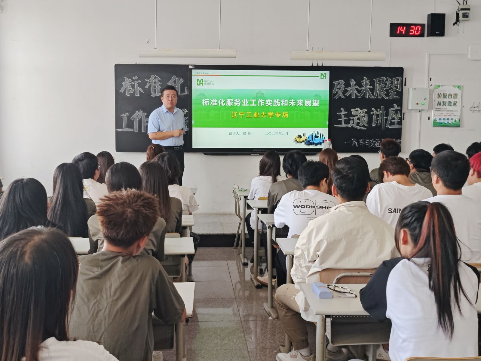 會(huì)后,鄭波為遼寧工業(yè)大學(xué)標(biāo)準(zhǔn)化工程專業(yè)全體學(xué)生作了題為《標(biāo)準(zhǔn)化服務(wù)業(yè)工作實(shí)踐和未來展望》的專題授課。簽約活動(dòng)前,鄭波一行還在李剛院長(zhǎng)帶領(lǐng)下參觀了汽車與交通工程學(xué)院實(shí)驗(yàn)室、萬得車隊(duì)。