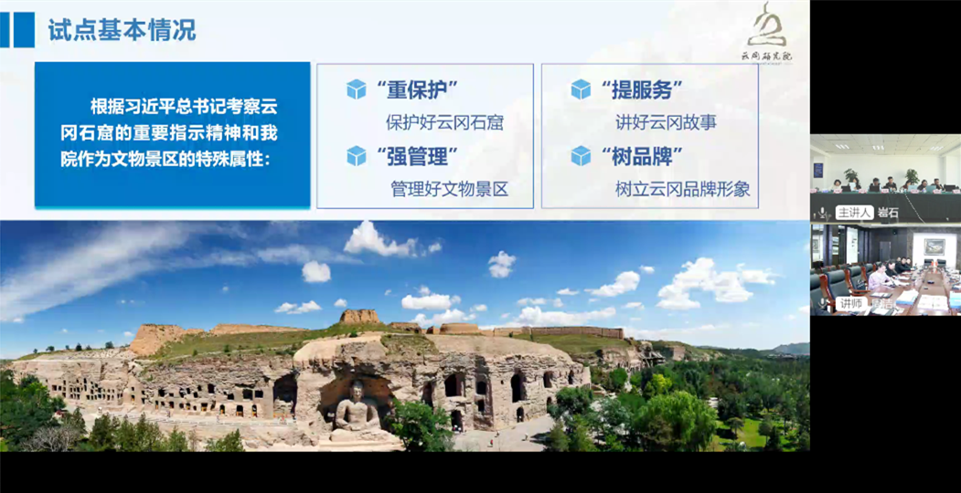 在線上匯報(bào)環(huán)節(jié),考核評(píng)估專家組通過聽取匯報(bào)、質(zhì)詢答辯的形式,對(duì)云岡研究院承擔(dān)的“云岡研究院旅游服務(wù)標(biāo)準(zhǔn)化試點(diǎn)”進(jìn)行了綜合評(píng)估,高度肯定了試點(diǎn)建設(shè)成效和創(chuàng)新成果,同時(shí)建議圍繞旅游高質(zhì)量發(fā)展需求,改進(jìn)提升標(biāo)準(zhǔn)體系,不斷強(qiáng)化標(biāo)準(zhǔn)實(shí)施和持續(xù)改進(jìn),深挖旅游服務(wù)標(biāo)準(zhǔn)化建設(shè)工作亮點(diǎn),總結(jié)提煉經(jīng)驗(yàn)?zāi)J?,形成可?fù)制、可推廣的云岡標(biāo)準(zhǔn)化樣板。