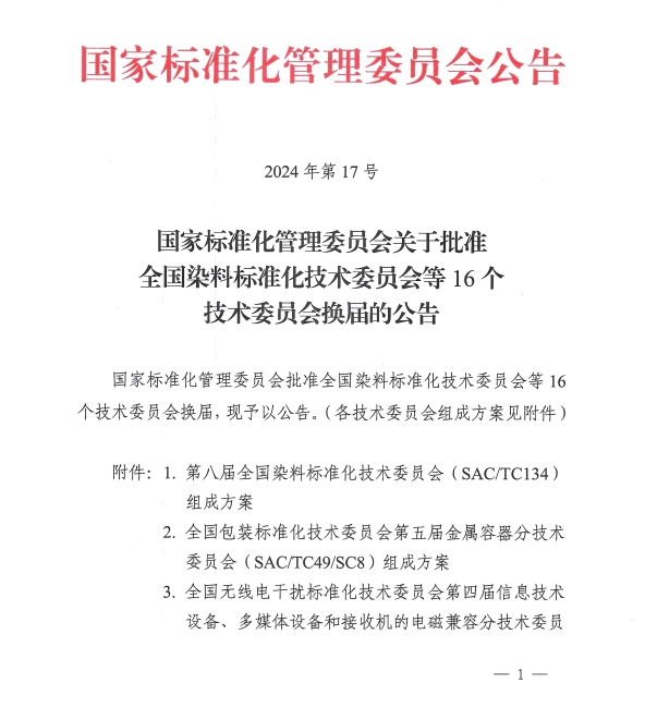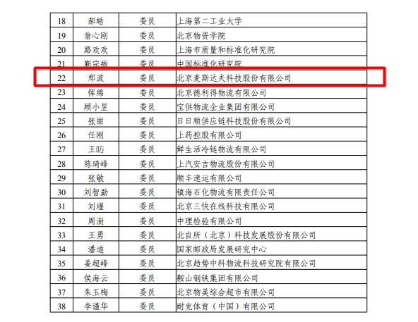 2024年7月29日,國家標(biāo)準(zhǔn)化管理委員會(huì)發(fā)布2024年第17號(hào)公告,批準(zhǔn)全國染料標(biāo)準(zhǔn)化技術(shù)委員會(huì)等16個(gè)技術(shù)委員會(huì)換屆。麥斯達(dá)夫標(biāo)準(zhǔn)化首席執(zhí)行官鄭波榮耀當(dāng)選第五屆全國物流標(biāo)準(zhǔn)化技術(shù)委員會(huì)委員。