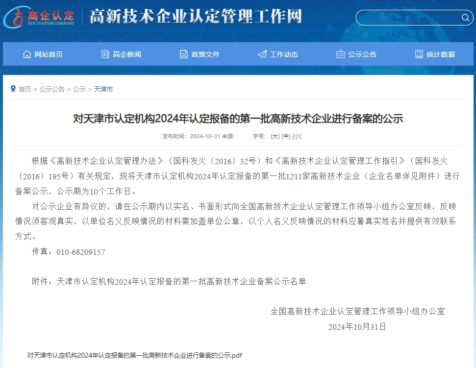 根據(jù)《高新技術(shù)企業(yè)認(rèn)定管理辦法》(國科發(fā)火〔2016〕32號)和《高新技術(shù)企業(yè)認(rèn)定管理工作指引》(國科發(fā)火〔2016〕195號)有關(guān)規(guī)定,天津市認(rèn)定機(jī)構(gòu)2024年認(rèn)定報(bào)備的第一批1211家高新技術(shù)企業(yè)名單于2024年10月31日公示。天津麥斯達(dá)夫標(biāo)準(zhǔn)化服務(wù)有限公司榮耀位列其中,繼北京總部、深圳公司、廣州公司之后,成為麥斯達(dá)夫集團(tuán)第四家國家高新技術(shù)企業(yè)。