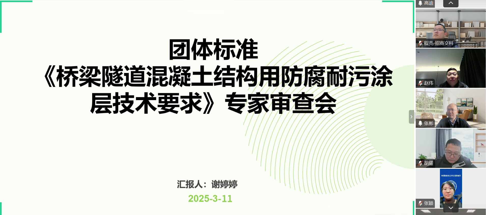 2025年3月11日,中國城市公共交通協(xié)會以線上會議形式組織召開團體標準《橋梁隧道混凝土結(jié)構(gòu)用防腐耐污涂層技術(shù)要求》專家審查會。中國地質(zhì)大學(北京)、招商局重慶交通科研設(shè)計院有限公司、中國工程建設(shè)標準化協(xié)會、中鐵隧道集團二處有限公司、中國城市公共交通協(xié)會的五名專家組成標準審查專家組。標準主編單位中宜硅材(蘇州)納米新材料科技有限公司總經(jīng)理陳海龍、技術(shù)經(jīng)理胡耀以及參編單位代表參加會議。會議由麥斯達夫標準化市場總監(jiān)、蘇州公司總經(jīng)理王釗柱主持。