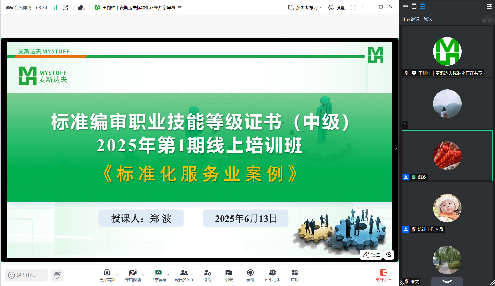 2025年6月13日,麥斯達(dá)夫集團(tuán)創(chuàng)始人、首席執(zhí)行官鄭波受邀在“標(biāo)準(zhǔn)編審職業(yè)技能等級(jí)證書(中級(jí))2025年第1期線上培訓(xùn)班”中擔(dān)任講課嘉賓,為全國(guó)一百三十余名學(xué)員講授題為《標(biāo)準(zhǔn)化服務(wù)業(yè)案例》的課程。