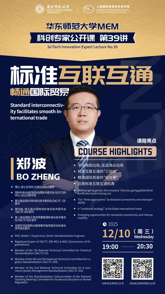 2025年12月10日,華東師范大學(xué)(上海國(guó)際首席技術(shù)官學(xué)院)成功舉辦科創(chuàng)專(zhuān)家公開(kāi)課第39講。本次課程特邀麥斯達(dá)夫集團(tuán)創(chuàng)始人、首席執(zhí)行官鄭波,以《標(biāo)準(zhǔn)互聯(lián)互通 暢通國(guó)際貿(mào)易》為題,為MEM(工程管理碩士)新生及與會(huì)師生帶來(lái)一場(chǎng)緊扣時(shí)代脈搏的專(zhuān)題講座。