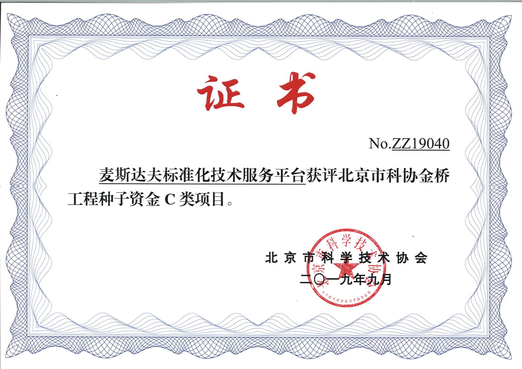 按照《北京市科協(xié)“金橋工程種子資金”實施細(xì)則(2019年試行稿)》、《北京市科協(xié)金橋工程種子資金項目評審指標(biāo)與說明》的相關(guān)規(guī)定,經(jīng)專家組初評、復(fù)評、投票,共推選出6項A類項目,10項B類項目和44項C類項目。麥斯達(dá)夫標(biāo)準(zhǔn)化事務(wù)所申報的“麥斯達(dá)夫標(biāo)準(zhǔn)化技術(shù)服務(wù)平臺項目”成功入選。