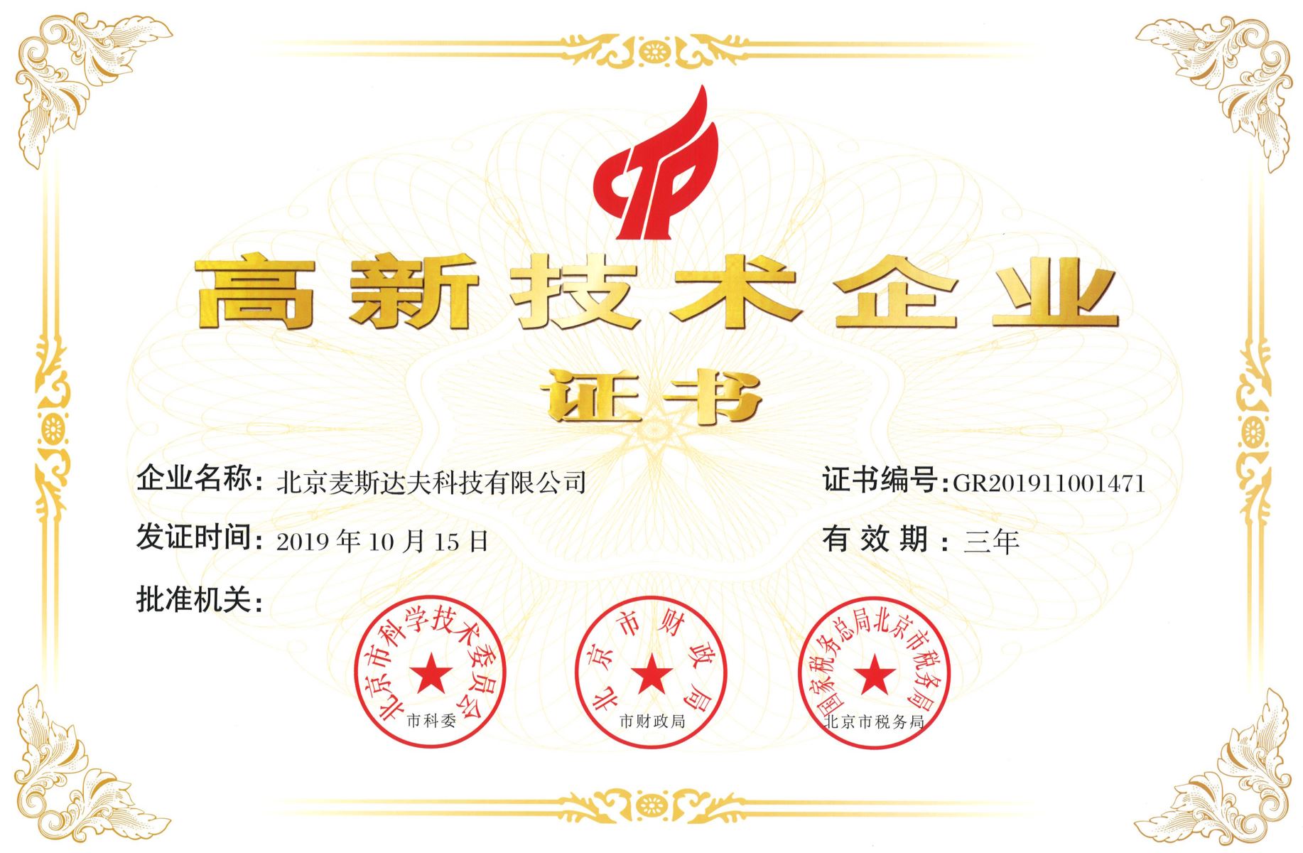 2019年10月15日,北京麥斯達(dá)夫科技有限公司獲批“國家高新技術(shù)企業(yè)”稱號(hào),認(rèn)定類型為高技術(shù)服務(wù)業(yè)企業(yè)。