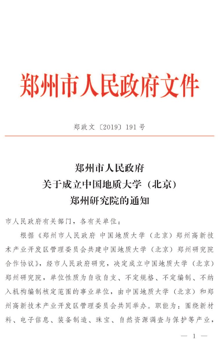 鄭州市人民政府關(guān)于成立中國(guó)地質(zhì)大學(xué) (北京)鄭州研究院的通知