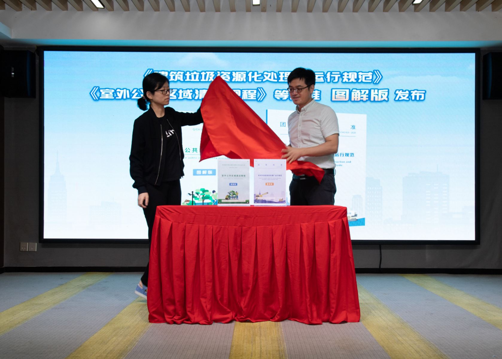 國家標(biāo)準(zhǔn)技術(shù)審評中心李實和麥斯達夫聯(lián)合創(chuàng)始人、深圳公司總經(jīng)理高武龍為《建筑垃圾資源化處理廠運行規(guī)范》《室外公共區(qū)域清潔規(guī)程》兩項標(biāo)準(zhǔn)圖解版揭幕。