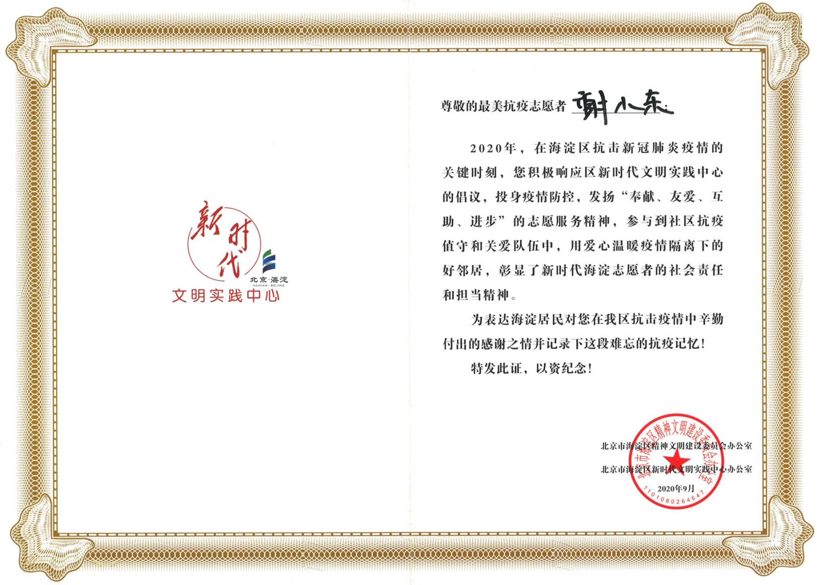 為深入貫徹習(xí)近平總書記關(guān)于堅決打贏疫情防控阻擊戰(zhàn)的重要指示精神,進一步關(guān)心激勵疫情防控人員,7月,海淀區(qū)新時代文明實踐中心開啟了第二批"最美抗疫志愿者"征集活動,經(jīng)過廣大人民群眾的推選點贊,共產(chǎn)生674位“最美抗疫志愿者”。麥斯達夫“標(biāo)兵共產(chǎn)黨員服務(wù)隊”隊員王超、謝小東、陳達獲評海淀區(qū)“最美抗疫志愿者”榮譽稱號。