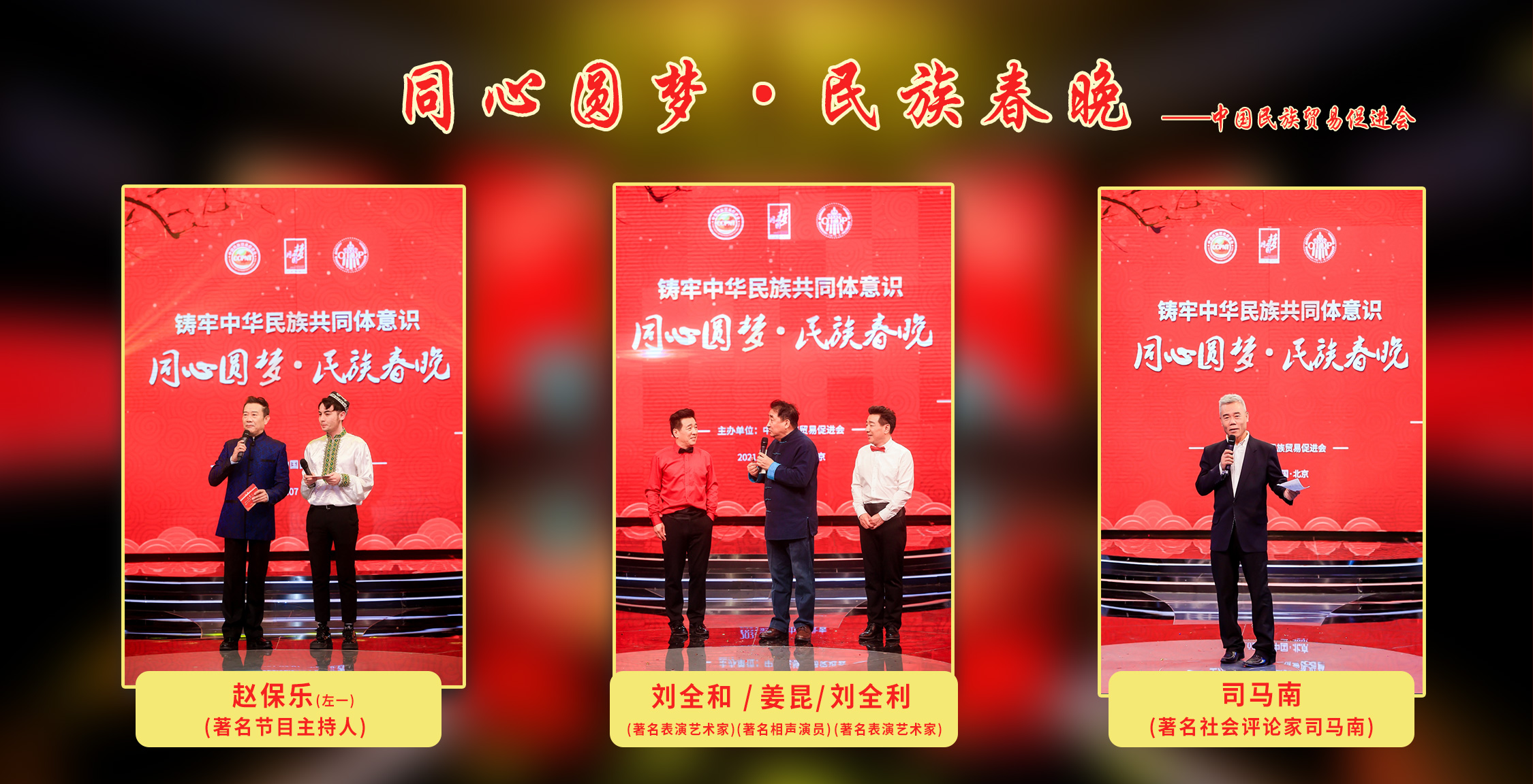 本次直播盛典由中國民族貿(mào)易促進(jìn)會牽頭主辦,嘉賓薈萃、陣容強(qiáng)大、精彩紛呈。中國曲藝家協(xié)會主席、著名相聲演員姜昆,著名節(jié)目主持人趙保樂,著名評書表演藝術(shù)家劉蘭芳,著名幽默滑稽表演藝術(shù)家劉全利、劉全和,《星光大道》冠軍選手陸海濤,《五洲唱響樂團(tuán)》主唱歌手好弟,獨(dú)立學(xué)者、著名社會評論家司馬南以及本次盛典總策劃、著名軍旅藝術(shù)家張保和等“同心圓夢”的新老朋友齊聚一堂站上云端,獻(xiàn)上一場有溫度、有鄉(xiāng)情、有年味的“新春嘉年華”,與全國各民族同胞一起線上聯(lián)歡,恭賀新春。
