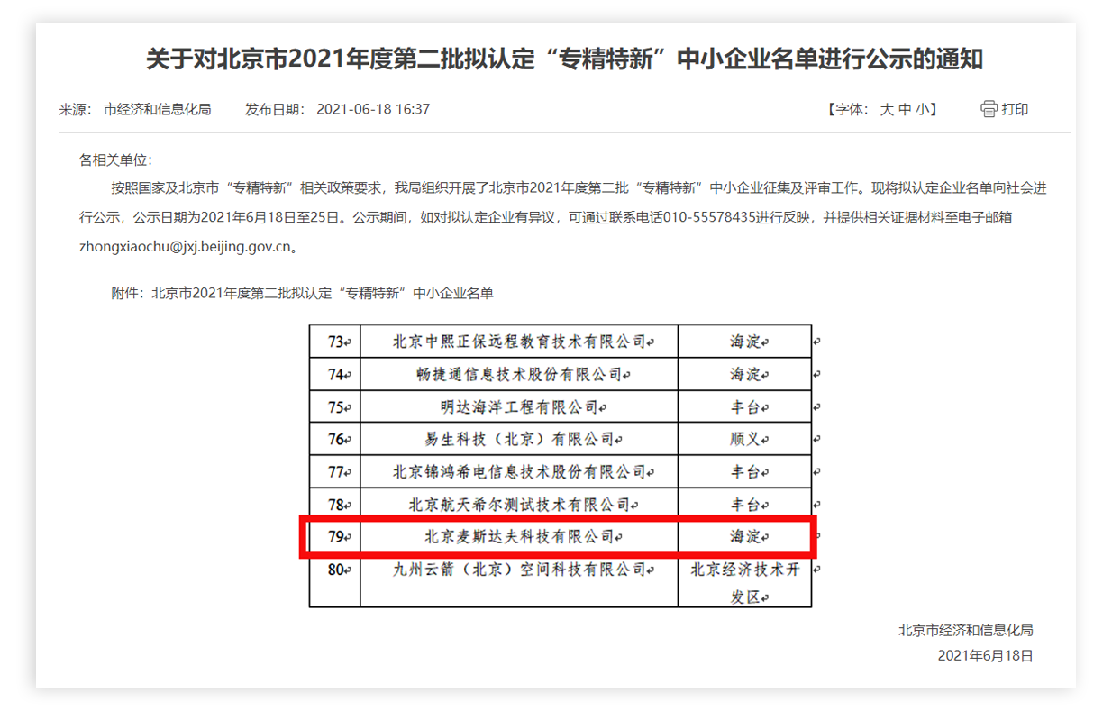 為深入貫徹習(xí)總書記關(guān)于“培育一批‘專精特新’中小企業(yè)”的重要指示精神,財(cái)政部、工業(yè)和信息化部聯(lián)合印發(fā)了《關(guān)于支持“專精特新”中小企業(yè)高質(zhì)量發(fā)展的通知》,根據(jù)《通知》,將通過中央財(cái)政資金引導(dǎo),促進(jìn)上下聯(lián)動(dòng),將培優(yōu)中小企業(yè)與做強(qiáng)產(chǎn)業(yè)相結(jié)合,加快培育一批專注于細(xì)分市場(chǎng)、聚焦主業(yè)、創(chuàng)新能力強(qiáng)、成長(zhǎng)性好的專精特新“小巨人”企業(yè),推動(dòng)提升專精特新“小巨人”企業(yè)數(shù)量和質(zhì)量,助力實(shí)體經(jīng)濟(jì)做強(qiáng)做優(yōu)。北京麥斯達(dá)夫科技有限公司通過多年努力,于近日成功入選北京市第二批 “專精特新”中小企業(yè)名單。