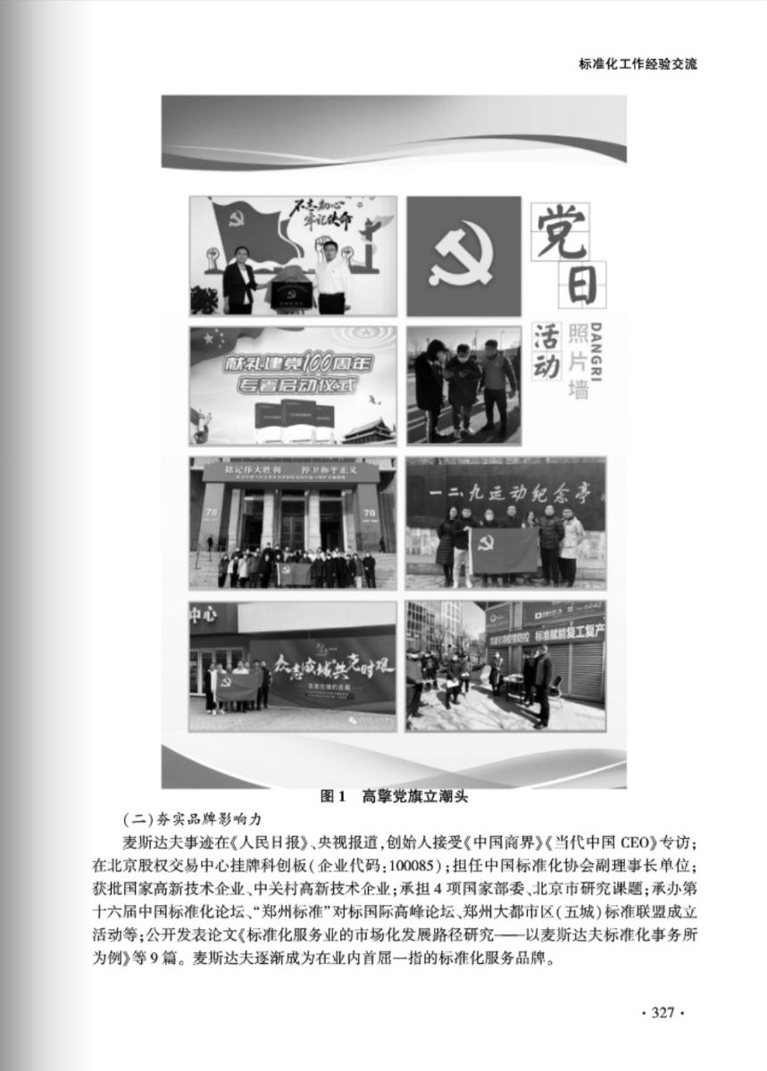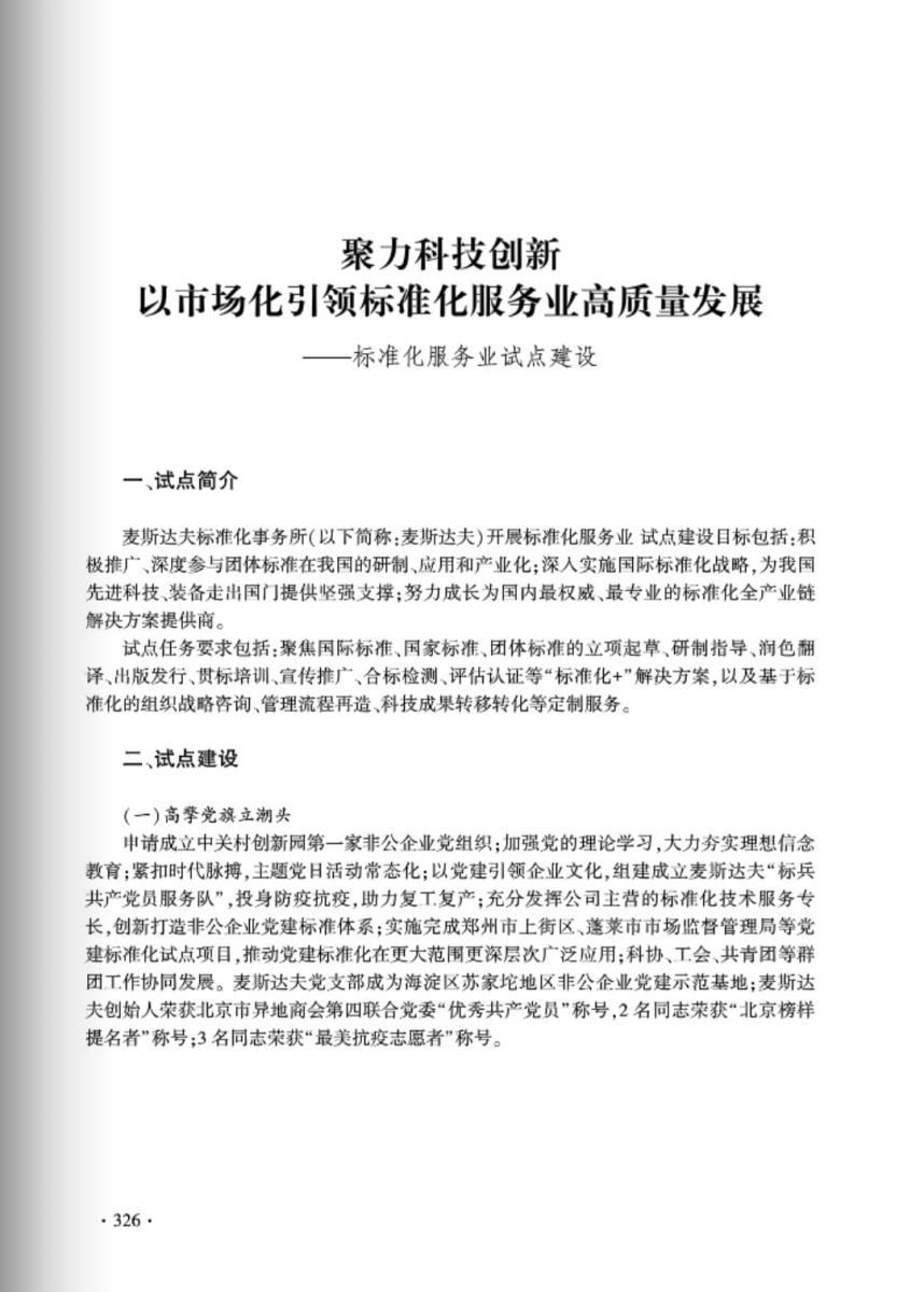 “聚力科技創(chuàng)新 以市場化引領(lǐng)標準化服務(wù)業(yè)高質(zhì)量發(fā)展”以麥斯達夫高分通過標準化服務(wù)業(yè)試點驗收為基礎(chǔ),由試點簡介、試點建設(shè)、試點成效、承擔單位簡介四部分內(nèi)容組成。全文以圖文并茂的形式充分展示了麥斯達夫標準化服務(wù)業(yè)試點經(jīng)驗和公司發(fā)展路徑以及試點期間取得的顯著經(jīng)濟、社會效益等內(nèi)容,標志著麥斯達夫標準化事務(wù)所已經(jīng)在標準化服務(wù)業(yè)中成為佼佼者,也必然引領(lǐng)北京市乃至全國標準化服務(wù)業(yè)的發(fā)展。