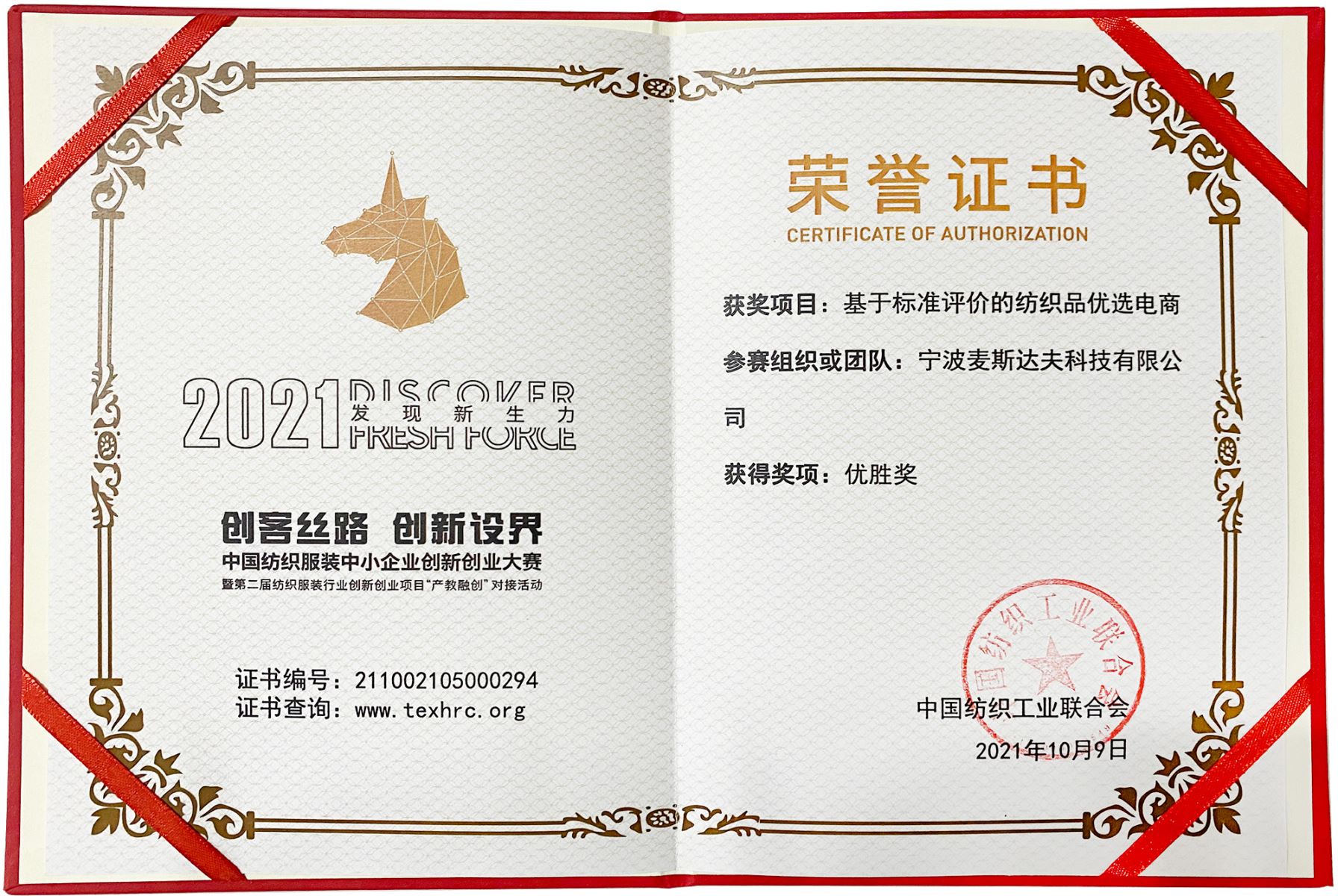 寧波麥斯達(dá)夫榮獲2021年中國(guó)紡織服裝中小企業(yè)創(chuàng)新創(chuàng)業(yè)大賽優(yōu)勝獎(jiǎng)