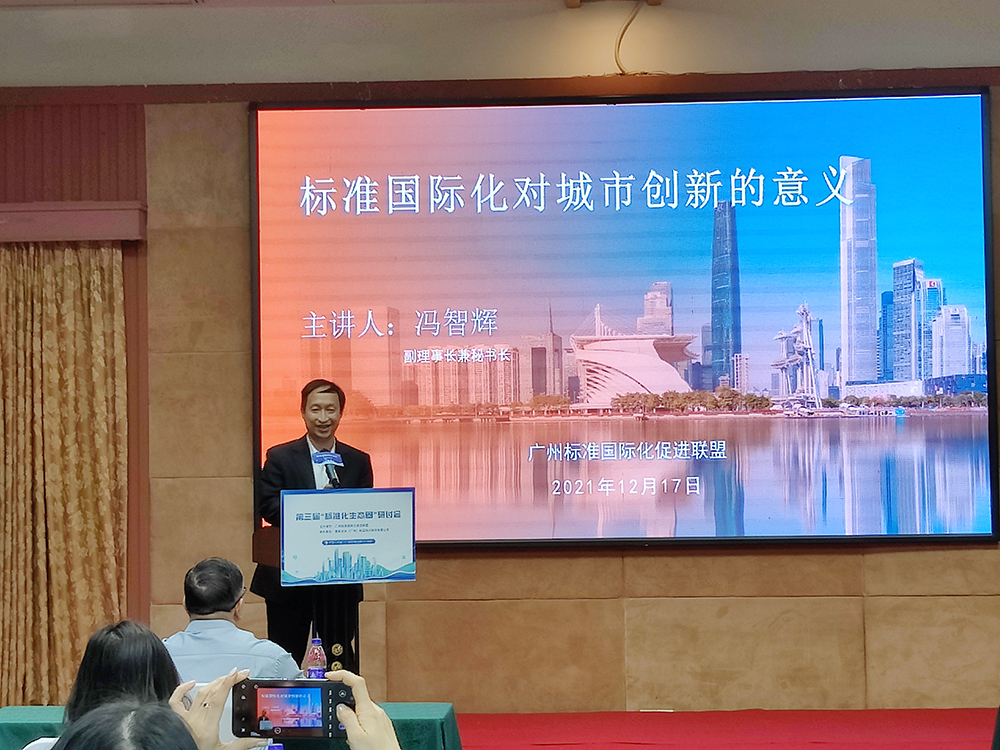 主題演講環(huán)節(jié),首先由廣州市標(biāo)準(zhǔn)化研究院副院長馮智輝作《標(biāo)準(zhǔn)國際化對城市創(chuàng)新的意義》的主題報告。