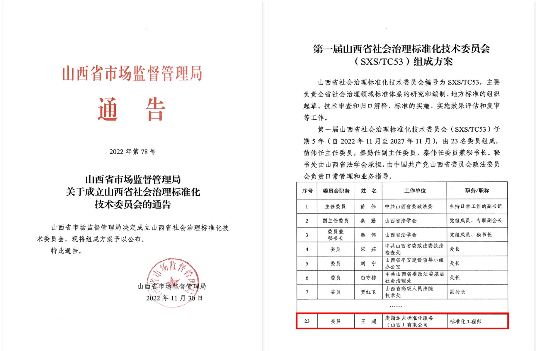 2022年11月30日,山西省市場監(jiān)督管理局決定成立山西省社會(huì)治理標(biāo)準(zhǔn)化技術(shù)委員會(huì),并公布了組成方案。麥斯達(dá)夫標(biāo)準(zhǔn)化首席運(yùn)營官王超當(dāng)選第一屆山西省社會(huì)治理標(biāo)準(zhǔn)化技術(shù)委員會(huì)委員。