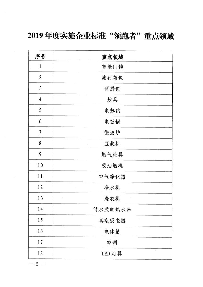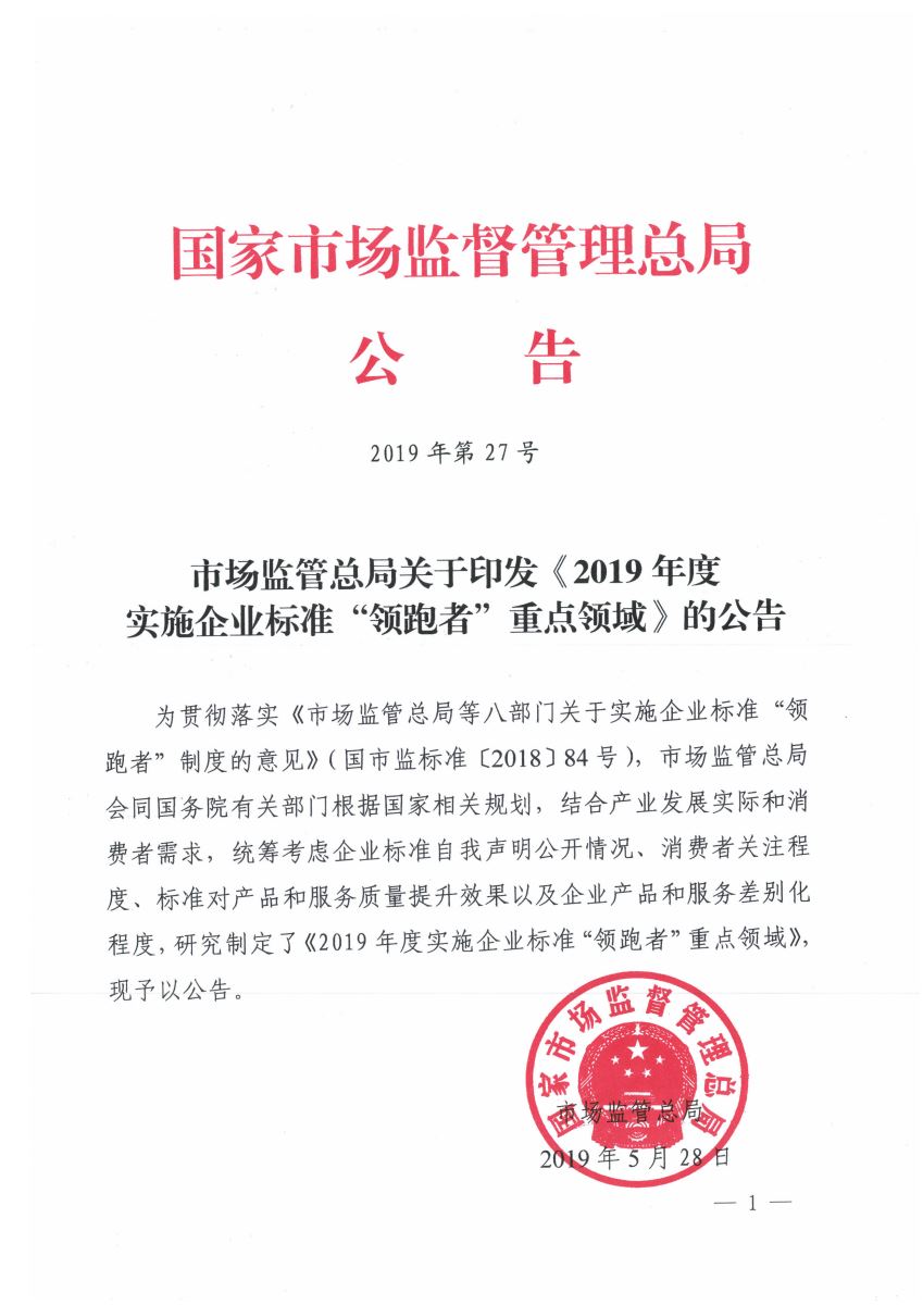 市場監(jiān)管總局關(guān)于印發(fā)《2019年度實施企業(yè)標準“領(lǐng)跑者”重點領(lǐng)域》的公告